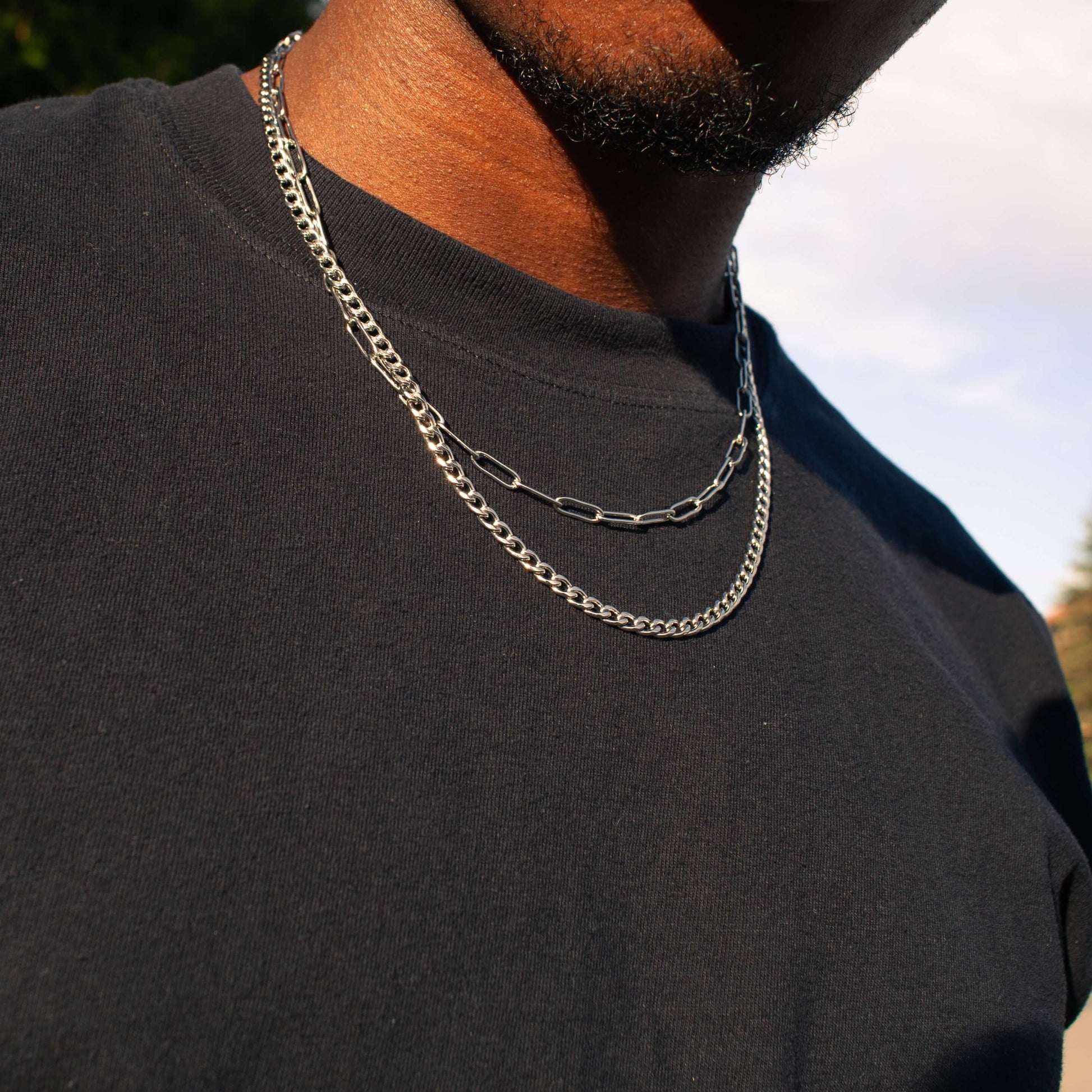 - Includes two necklaces: a 4mm paperclip chain and a 4mm curb chain